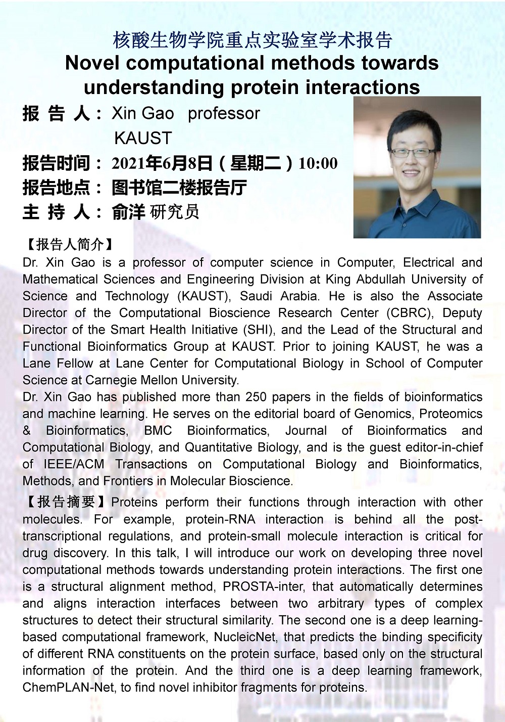 2021年6月8日上午10:00 核酸生物学重点实验室学术报告:Novel computational methods towards understanding protein interactions