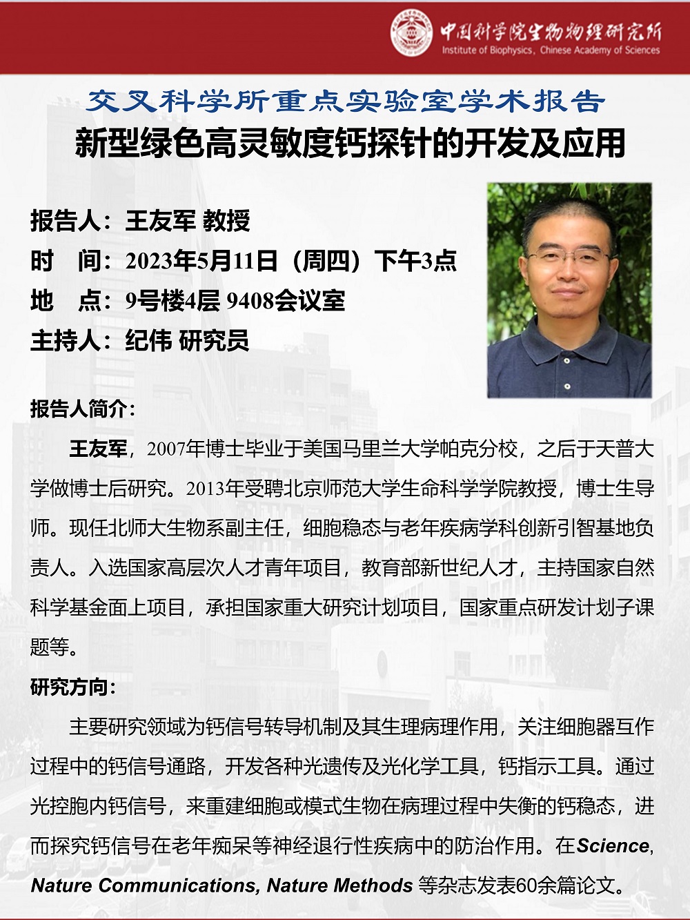 2023年5月11日下午3:00 交叉科学所重点实验室学术报告:新型绿色高灵敏度钙探针的开发及应用