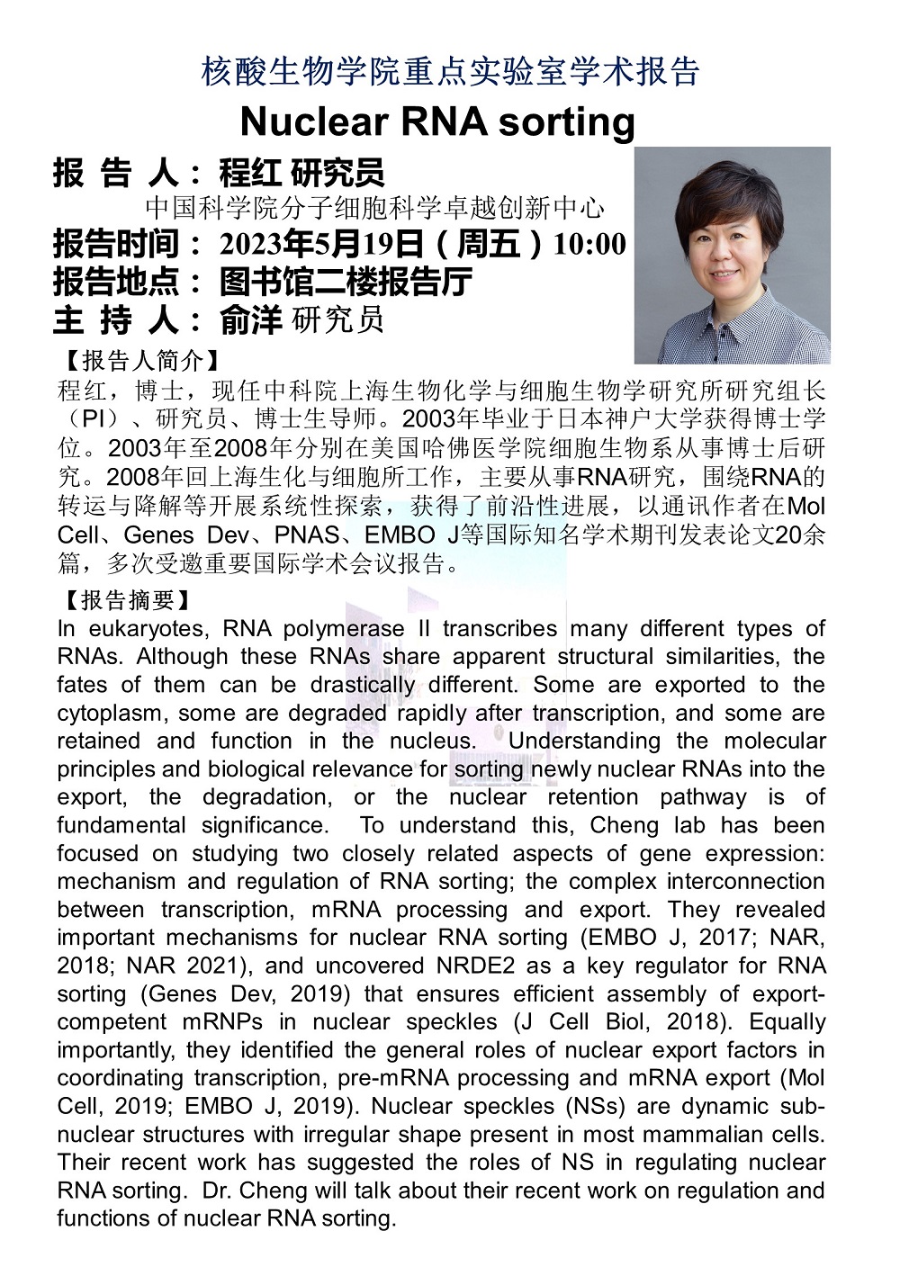 2023年5月19日上午10:00 核酸生物学院重点实验室学术报告:Nuclear RNA sorting