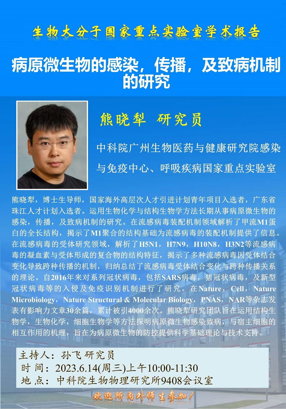 2023年6月14日上午10:00 生物大分子室级学术报告:病原微生物的感染、传播,及致病机制的研究