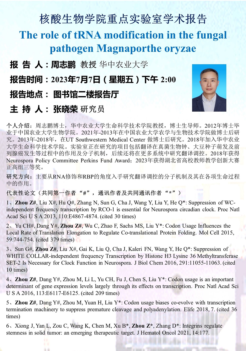 2023年7月7日下午2:00 核酸生物学院重点实验室学术报告:The role of tRNA modification in the fungal pathogen Magnaporthe oryzae