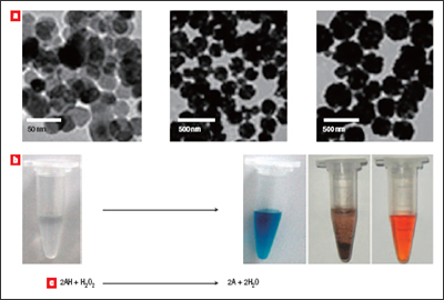在纳米医学研究中,氧化铁纳米颗粒作为一种理想的材料,可用于疾病诊断、控制药物释放和体内分子成像。氧化铁纳米颗粒通常用于分离和纯化蛋白质、DNA、病毒和细胞。这主要是利用氧化铁纳米颗粒的磁性,如果将其表面连接抗体,也就是一种能够特异识别生物分子的蛋白质,它便具有靶向识别和磁性分离的双重功能。在医学应用中,传统的检测方法是将纳米颗粒的磁分离作用与酶标记的抗体免疫反应结合起来,后者通过酶催化底物显色显示生物分子的存在并进行定量。