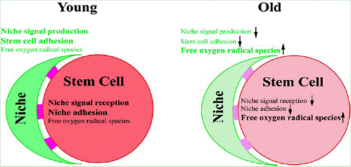年轻的周围支持细胞(Niche, 深绿色)相对于年老的周围支持细胞(浅绿色)维持较高的信号产出水平,同时处在年轻时期的干细胞(深红色)同样相对于老年的干细胞(浅红色)拥有较高的信号接收水平。两者之间由E-cadherin介导的粘附作用(深紫色)也随着衰老变弱(浅紫色)。反而,对细胞有伤害作用的代谢产物-活性氧自由基会逐渐在老年的细胞内累积,从而导致干细胞数目减少以及自我更新和分化能力的减退。