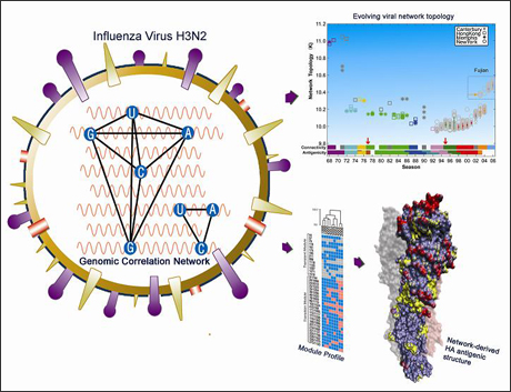 图:流感的基因组相关性网络的结构演化反映了人流感抗原性改变的规律