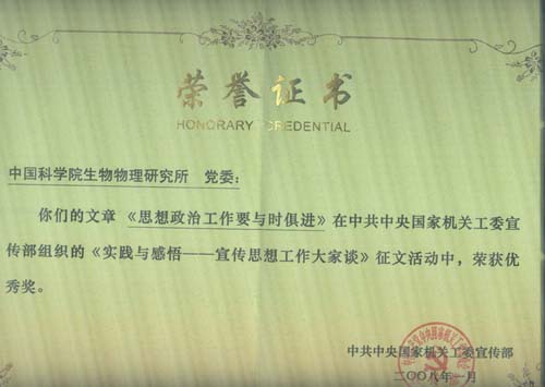 在中共中央国家机关工委宣传部组织的征文活动中,生物物理研究所党委的《思想政治工作要与时俱进》一文获得“优秀论文奖”。