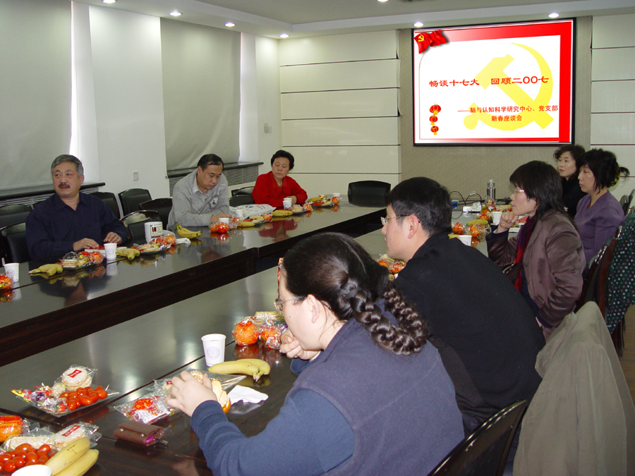 2008年2月1日,脑与认知科学研究中心党支部在2603会议室召开了以“畅谈十七大 回顾二OO七”为主题的座谈活动。所党委杨星科书记、党办翟涛同志应邀出席了座谈会。会议由支部书记马丽主持,支部党员和中心部分科研工作人员参加了座谈。
