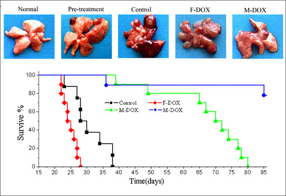 图2:阿霉素纳米胶束(M-DOX)显著抑制小鼠肺转移瘤的生长和延长生存时间。