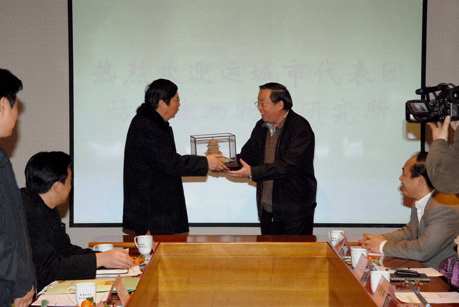 首先,杨星科书记代表研究所向张建喜副市长一行访问生物物理所表示热烈欢迎。为了感谢生物物理所近年来对运城市相关产业发展的大力支持,并祝愿生物物理所在新的一年里各项工作更上一层楼,张建喜副市长代表运城市向生物物理所赠送了鹳雀楼精雕模型作为礼物。杨星科书记代表研究所接受赠送,并对运城市政府和企业在与研究所的产学研合作中做出的不懈努力和贡献表示赞赏。
