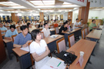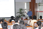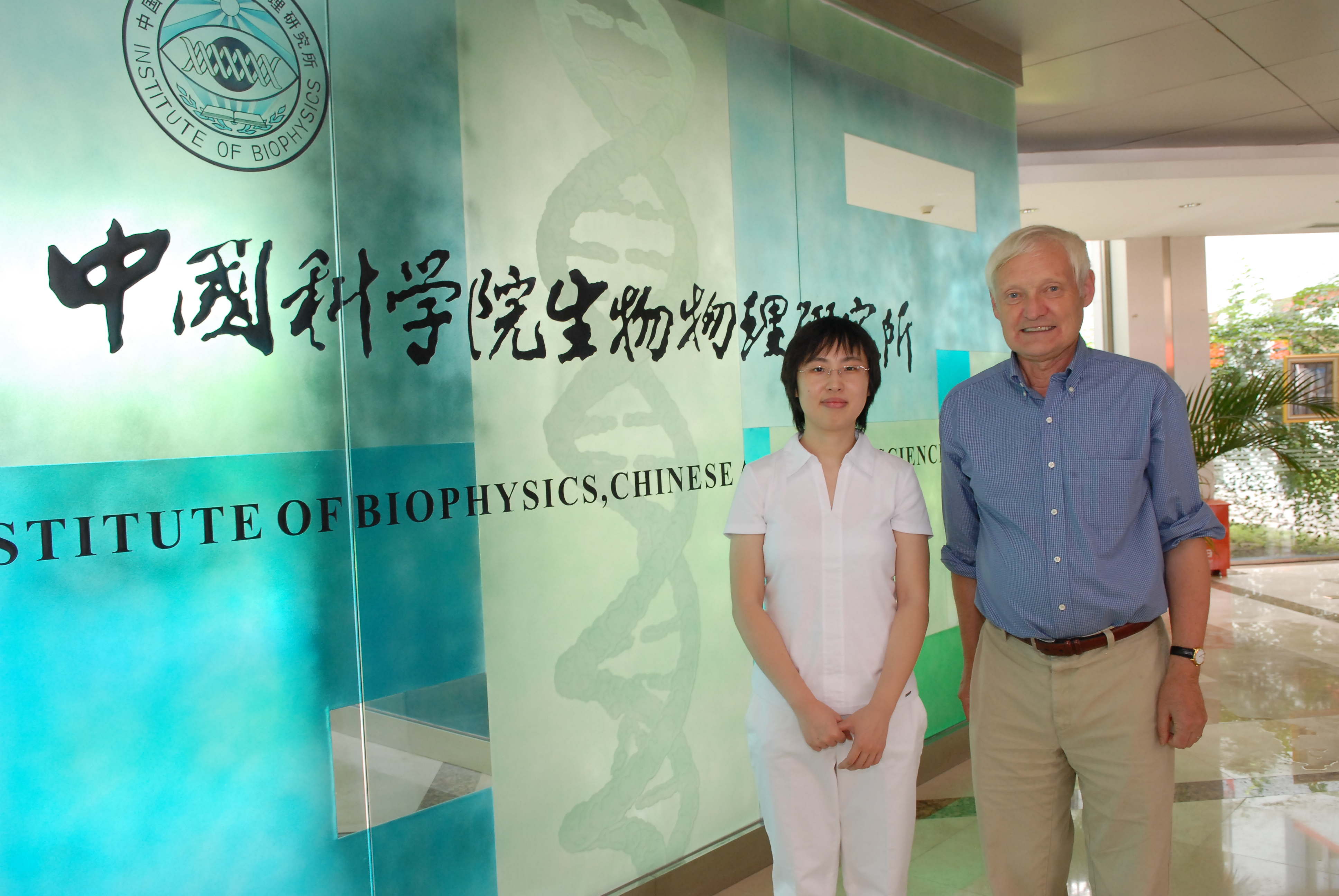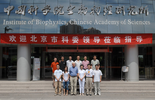 报告的开始,Joachim Frank教授首先介绍了冷冻电镜和单颗粒三维重构的基本原理和优点。通过急速冷冻,可以使分子极其复合物迅速冷冻并保持其自然状态。通过电镜获取到数十万的照片,通过计算机的重新拟合进行三维重构。Joachim Frank教授利用冷冻电镜和单颗粒三维重构技术相结合,首次获得了核糖体的精细三维结构,其分辨率达到6.7 ?。Joachim Frank教授还介绍了他们利用此方法进一步的研究了在蛋白质翻译的延伸过程中,核糖体、tRNA和各种分子(EF-Tu和EF-G)等的相互作用及其结构变化。他们观察到,在新生肽链延伸的过程中,核糖体的大小亚基会发生相互扭转,并认为这种扭转是自发的。同时,他们也发现氨酰tRNA进入核糖体和mRNA配对的过程中,其空间结构也会发生一定的改变。此外,Joachim Frank教授还观察到了大小亚基相互的作用位点,及其与tRNA之间的相互作用位点。Joachim Frank教授的报告持续了1个多小时,期间给我们展示了大量的核糖体三维结构和蛋白质合成延伸过程的动画短片。报告结束后,与会的老师和同学与Joachim Frank教授进行了热情的讨论,并在生物物理所门口合影。
