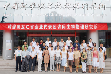2008年7月4日上午,由黑龙江省院士工作办公室与中科院长春分院组织的黑龙江生物医药企业代表团访问生物物理研究所。随行的有中科院院地合作局东北京津合作处陈文开 处长、西部合作处战超处长以及北京分院院地合处魏令波副处长。来访企业的包括哈尔滨仁皇药业有限公司、哈尔滨华雨制药集团有限公司、哈尔滨富尔斯特生物工程有限责任公司、黑龙江美康汇融生物技术股份有限公司等近20家企业的30余位企业代表。研究所所地合作处王琳处长及相关工作人员,以及宫丹、王孔江、杨东玲、董先智老师进行了热情接待。