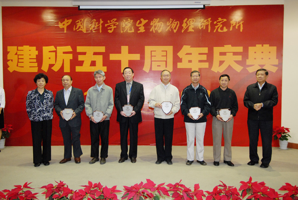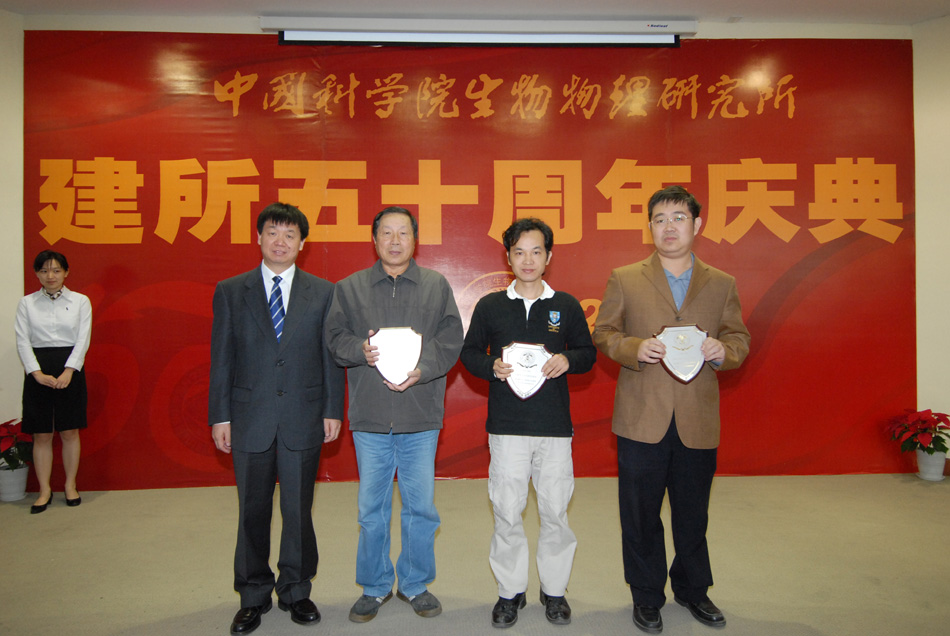 为建所50周年评选出为研究所创建和发展做出突出贡献个人和集体,庆祝会上现场为获奖者颁奖。他们分别为:突出贡献个人奖获得者为王大成、江丕栋、杨星科、沈钧贤、陈润生、周忠年、郑竺英、饶子和;突出贡献集体奖获得者为平台技术服务组、果蝇学习记忆研究群体、捕光蛋白结构研究群体。