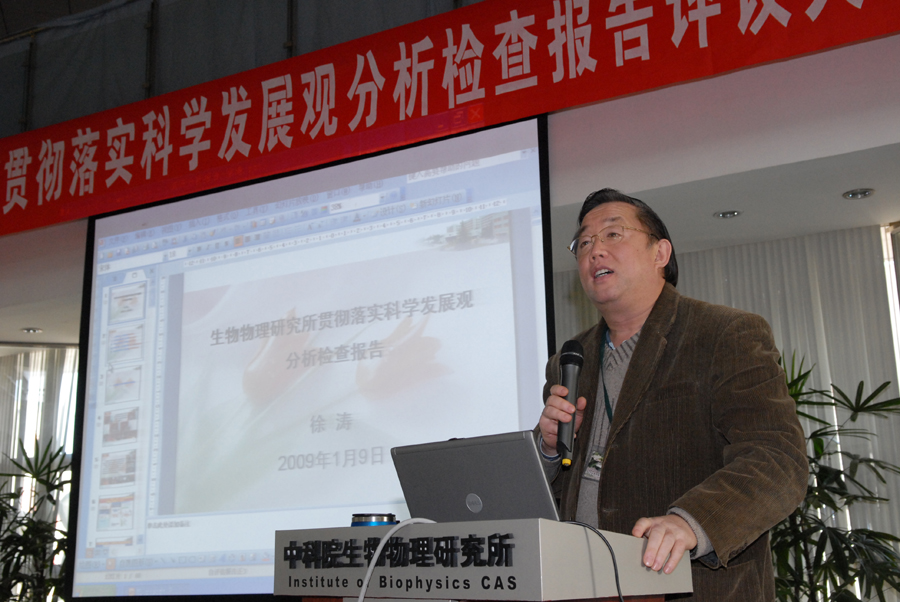 徐涛所长代表所领导班子作了“金沙集团1862cc领导班子贯彻落实科学发展观分析检查报告”。报告首先回顾了研究所在学习实践科学发展观活动第一、二阶段的工作,特别概括总结了所领导班子近年来在贯彻落实科学发展观、推动知识创新和改革发展方面取得的主要成就。报告指出,党的十六大以来,生物物理研究所领导班子带领全所广大职工,在邓小平理论和“三个代表”重要思想指导下,认真贯彻落实科学发展观,扎实推进知识创新工程和研究所改革发展,瞄准国家战略需求和世界科技前沿,进一步明确了学科发展定位和科技发展目标,加强了领域前沿部署和体制机制创新,加强了人才队伍建设、科技基础条件平台建设和创新文化建设,使研究所的创新机制不断完善,创新能力持续提升,创新氛围日益浓厚,创新成果更加显著,研究所各项工作迈上了一个新的台阶。