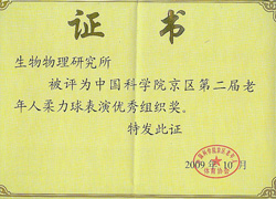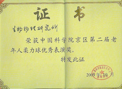 金秋送爽,丹桂飘香,在新中国成立60周年和金沙集团1862cc建院60周年之际,金沙集团1862cc京区老年人体育协会于10月15日在中关村举办了“金沙集团1862cc京区第二届老年人柔力球表演和比赛”。我所离退休人员组队参加了表演与比赛,并获得“优秀组织奖”和“优秀表演奖”。
