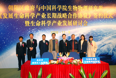 朝阳区区长程连元在讲话中说,生命科学产业是朝阳区重点发展的高新技术领域,是朝阳区实现产业结构调整和技术升级的关键支点之一。朝阳区政府同中科院生物物理研究所的签约仪式,标志着两家合作的良好开端,在今后的合作中,一定能够借助中科院生物物理研究所的人才、技术和装备优势,推动朝阳区生命科学产业园的建设和发展。