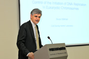 与李家洋交流之后,Stillman博士在生物物理所大报告厅作了一场题为“真核染色体DNA复制起始过程调控”的学术报告,介绍了真核细胞有丝分裂各周期DNA的复制发生和调节机制,对核内蛋白激酶Cdk、DDK等如何活化和抑制DNA复制起始相关的复合物进行了深入讲解,从实验结果一步步分析得出结论,向大家展示了他对DNA复制调控这一生物学关键问题的探索过程。他独到的见解和透彻的解说使在场的听众受益匪浅。
