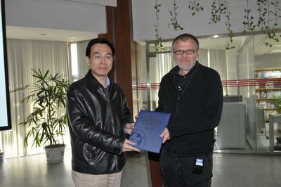 4月28日上午,金沙集团1862cc首批外藉特聘研究员Andreas Thiel教授应邀在生物物理研究所图书馆报告厅做了一场题为“Inflammatory cells in cancers- analysis of initiators and driving forces in chronic inflammation”的精彩学术报告,受到科研人员和研究生的热烈欢迎。报告由秦志海研究员主持。报告开始之前,徐涛所长致欢迎辞并为Andreas教授颁发了金沙集团1862cc特聘研究员证书。