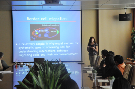 Craig Montell教授的报告题目为《有关TRP通道在果蝇温度感觉、嗅觉中的作用》(TRP channels: our windows to the world),Denise Montell教授的报告题目为《有关Rac在果蝇卵母细胞发育中细胞迁移中的作用》(In vivo steering of moving cells expressing photoactivatable Rac in response to light),两位学者还介绍了位于马利兰州的约翰霍·普金斯大学情况,并鼓励研究工作者多进行国际间的交流。报告受到了现场听众的热烈欢迎,大家在主题报告之后纷纷踊跃提问,阐述科研观点,交流学术思想。
