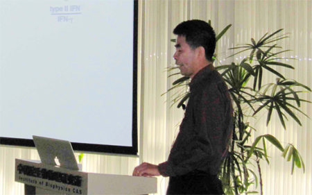 报告在任建副研究员幽默的介绍中开始。先,Lin Rongtuan教授着重于实验方面介绍了VSV与天然免疫中重要的细胞因子之间的相互作用,以及相关分子水平调控机制的研究进展。接下来,John Hiscott教授全面地介绍了他们实验室关于VSV治疗肿瘤的临床应用研究进展,面临的问题及发现的一些解决方法。他们通过对病毒与宿主间相互关系的分子调控机制的研究,针对性地筛选功能性的小分子,在很大程度上增强了VSV的抗肿瘤作用或者扩大VSV的临床应用范围。他们的报告加深了同学们对天然免疫以及病毒治疗肿瘤临床应用的认识,并且小分子的成功筛选和应用给生物物理研究所的学生们留下了深刻的印象。