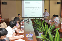 2010年6月1日,应生物物理研究所朱平研究员的邀请,即将加入中国医学科学院药用植物研究所的胡克平博士在蛋白质科学中心会议室做了一场题为“The Rett Syndrome Protein MeCP2 Is Regulated by Phosphorylation”的精彩学术报告。报告由朱平研究员主持,刘迎芳、李国红、袁增强研究员和任建副研究员等老师和同学参加了此次学术报告。
