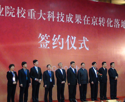 10月26日,“中央企业院校重大科技成果在京转化落地项目签约仪式”在北京国际饭店召开。中共中央政治局委员、北京市委书记刘淇,北京市委副书记、市长郭金龙,北京市委常委、常务副市长吉林,北京市委常委、市委秘书长李土祥,北京市委常委赵凤桐,北京市副市长苟仲文、北京市副市长黄卫等领导出席签约仪式。来自中央单位、市相关部门、区县、高校院所的200余名代表参加了签约仪式。本次签约共有25个重大专项落地北京,生物物理所的“重组人内皮抑素腺病毒注射液”是本次中科院4个落地项目之一。副所长朱美玉、所长助理高光侠、所地合作处董先智参加了签约仪式。