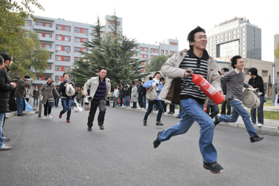 11月9日上午9时,随着安保办负责人王海龙口令的下达,各楼群中人员集体向楼外紧急疏散演习开始,职工、研究生立即放下手中工作,在安全员和保安人员的指挥下有组织、有秩序地向楼外紧急疏散。大家以手绢捂嘴,靠右侧迅速行进,到达指定地点9号楼广场。整个演练仅用了7分钟,参加人员620多人,在所内的所领导参加了演练活动。