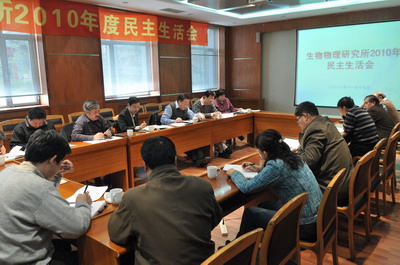 生物物理研究所2010年度党政班子民主生活会于 11月19日上午在小报告厅隆重举行。党政班子成员、党委委员、纪委委员及研究生总支和离退休总支书记参加了会议,北京分院院长助理、京区党委组织部部长肖建春同志,京区党委协作一片组织员李立军同志应邀出席了会议。会议由党委书记杨星科同志主持。