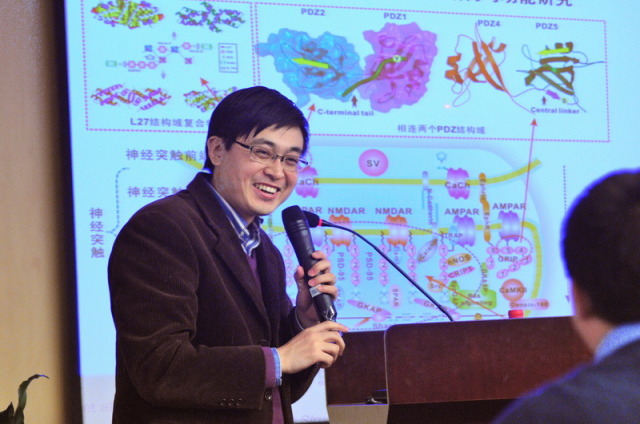 报告中冯巍研究员首先介绍了NMR技术在结构生物学领域的发展及应用,同时比较了NMR与X-Ray两大技术的优劣,NMR技术可更加广泛地应用于生物大分子溶液状态下的三维结构、分子间的相互作用,以及分子动力学过程的研究。其次他介绍了自己在博士以及博士后期间的重要研究成果,主要是基于液体核磁共振技术,结合其他结构生物学方法,研究与神经细胞内信号传导、细胞极性以及胞内货物运输等相关的生物学问题,并重点介绍了如何利用核磁共振技术解析相关重要蛋白质复合物(包括PDZ复合物、L27结构域、moysin VI C端结构域等)结构的过程。最后,他介绍了实验室现阶段的部分研究进展。