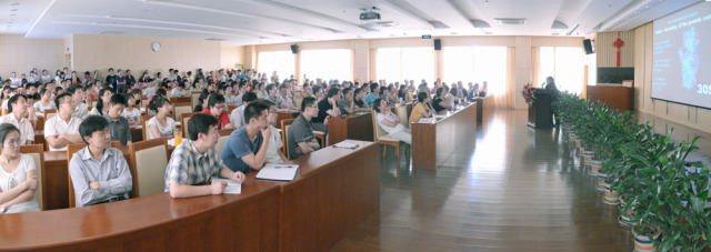 会谈后,在许瑞明副所长的主持下,Ada Yonath教授在9501会议室做学术报告。报告会的听众多达160多人,不仅包括生物物理所的众多师生,还吸引来中科院遗传发育所、动物所、微生物所、基因组所、北京大学、清华大学等科研院所的教授和学生。以色列驻华大使Amos Nadai先生在报告会上致辞。他提到以色列虽然是一个小国家,但在众多科技领域具备一流的水平;中国目前科技飞速发展,成就令世人瞩目。他表示非常希望两国在科技领域加强合作与交流。Ada Yonath教授的报告题目为“From Basic Science to Improved Ribosomal Antibiotic”。在报告中,她深入浅出地介绍了以核糖体为靶位点的抗生素研发以及核糖体结晶等学术内容,同时她还以孙女为她颁发的“年度最佳奶奶奖”为例向青年女学者们展示了作为女性是可以同时拥有成功的事业和幸福的家庭的,在家庭的理解和支持下,女性同样可以攀登科研高峰,成就精彩人生。报告展现了Ada Yonath教授对科学的执著与热爱。现场气氛非常热烈,听众借此机会向Ada Yonath教授请教,与大师进行了面对面的交流。