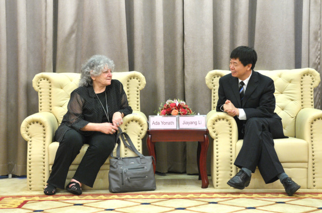 6月14日上午,在以色列驻华大使Mr. Amos Nadai及大使馆工作人员陪同下,以色列籍女科学家、2009年诺贝尔化学奖获得者Ada Yonath教授来到生物物理研究所进行学术访问。中科院李家洋副院长、院国际合作局邱华盛副局长、院国际合作局亚非处孙辉副处长、生物物理所许瑞明副所长、研究所国际合作与交流处热情地接待了来访外宾。双方在贵宾室与进行了简短会谈。李家洋副院长对Ada Yonath教授一行的来访表示热烈的欢迎。他向Ada Yonath教授介绍了金沙集团1862cc的战略发展布局,特别是生命科学领域的研究情况。他表示中科院非常重视与国际一流学术机构和顶级科学家之间进行广泛的交流与合作,共同探讨世界科技前沿。