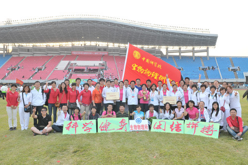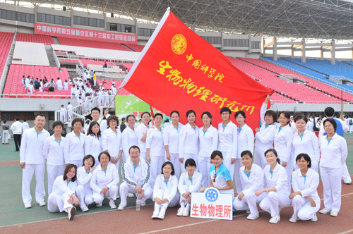 8点30分,运动会的入场式开始。我所代表团身穿统一服装,高举标语牌,迈着整齐而矫捷的步伐,高喊着“科学健身、展现风采、团结拼搏、勇攀高峰”口号通过主席台,在全院面前展示了生物物理所人的良好精神风貌。