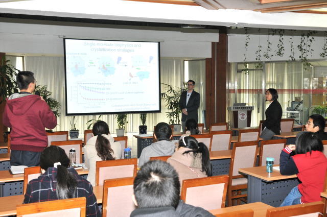 上午9点整,Jamie H. Doudna Cate副教授在图书馆报告厅带来了题目为“The Structural Basis of Protein Synthesis in Bacteria and Humans”的精彩报告。Cate 实验室于2005年解析了E.coli 70S 核糖体的结构,发表在Science杂志,之后运用结晶技术解析了多种抗生素与E.coli核糖体复合物结构,阐述了其作用机制,为设计新的抗生素提供依据。报告的开始,JH Cate副教授首先介绍了核糖体的结构功能和蛋白质翻译的过程。接下来Cate副教授介绍了他的最新发现,核糖体释放因子(RRF)能使核糖体稳定在完全旋转的状体(fully rotated state);抗生素新生霉素(Neomycin)能使核糖体稳定在一个新的中间状态(P/pe state),而巴龙霉素(Paromomycin)则使核糖体处于不能旋转的状态。JH Cate副教授的报告持续了1个多小时,期间展示了大量的核糖体和翻译因子三维结构和蛋白质合成转运过程的模型。
