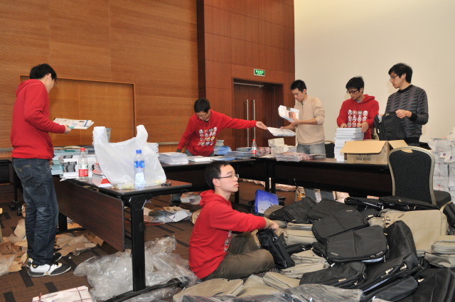 机动组是贯穿整个会期,工作最为繁琐的小组。由于会场需求的不确定性,机动组的志愿者始终保持着随时待命的状态。注册前一天,大家紧张有序地搬运、分装会议资料,一直忙到晚上十点,满足了注册当天资料袋的发放需求。在随后的几天会期中,随处可见机动组志愿者的身影,搬运资料及会场用品、引导代表就餐、张贴指示牌等等,是一支团结的勤务兵队伍。