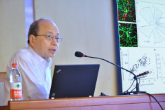 报告中King-Wai Yau教授首先介绍了1990年代来自身感光视神经节细胞(ipRGCs)的发现历程。视杆细胞与视锥细胞之外的这类新发现的感光神经细胞,以视黑质作为感光色素,投射到视交叉上核(SCN)、橄榄顶盖前核(OPN)等广泛的脑区,负责节律周期的光同步、瞳孔光反射等非成像视觉功能。已经发现存在5类ipRGCs(M1-M5),占视神经节细胞的1-3%。之后King-Wai Yau教授介绍了其研究组近期在这方面的工作。在神经元层面他们发现去除ipRGCs不影响成像、但会和阻断所有三种感光细胞的光信号转导类似程度地影响涉及光照度感知的节律周期的光同步、瞳孔光反射等行为,说明光照度视觉和图案视觉在视神经节细胞阶段分离。他们还发现ipRGCs的感光色素膜密度远远低于视杆细胞和视锥细胞的,因此其只对相对强的光起反应;并利用电生理的手段研究解离的ipRGCs、通过与原位视网膜铺片以及预测数据进行比较,发现单光子吸收足以引起ipRGCs的反应,且相对于视杆细胞和视锥细胞,每个捕获的光子能引起较强、而且相当持久的反应。在分子层面,他们发现在小鼠中目前研究较多、对光最敏感的M1-ipRGCs的光转导需要TRPC6和TRPC7离子通道以及磷酸酶PLCbeta4。报告中King-Wai Yau教授不仅注重生物物理研究中的定量数值,而且结合自己对鲶鱼、恒河猴等动物的研究从进化的视角对视觉器官、感光细胞器、光信号转导通路进行思考,给人留下了深刻的印象。