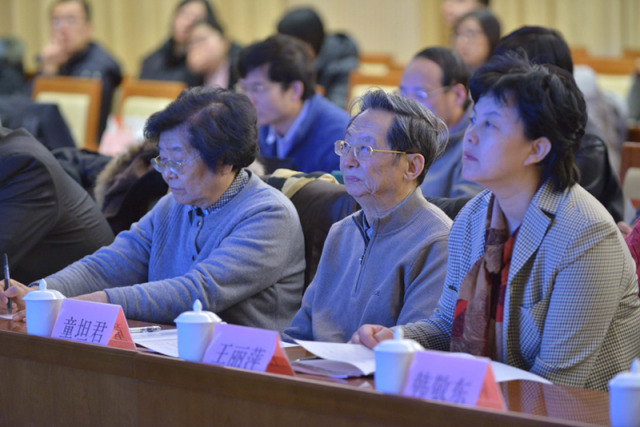 与会人员认真聆听报告(张宗玉教授(左),童坦君院士(中),王丽萍处长(右))