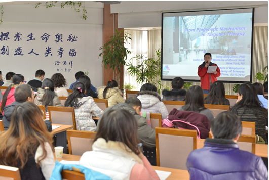 2013年12月17日,应中科院生物物理研究所生物大分子国家重点实验室许瑞明研究员邀请,美国纽约西奈山伊坎医学院(Icahn School of Medicine at Mount Sinai)结构与化学生物系的周明明教授来所进行学术交流,并于上午10:30在研究所图书馆报告厅做题为“From Epigenetic Mechanism to targeted therapy”的精彩报告。