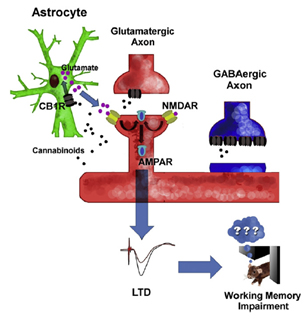 报告中,张遐教授从大麻的临床和科研历史讲起,由大麻成瘾会引起严重的记忆力衰退过渡到大麻素受体CB1R和CB2R,进而提出内源性大麻在生理过程中发挥什么功能的重大科学问题。张教授还介绍到,从1999年至今,他们实验室一直针对这一问题进行着不断的探索和尝试,得到了一系列的研究成果以及科学的推测,总结起来如左图。