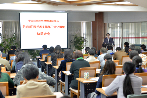 4月10日下午,生物物理所职能部门和学术支撑部门优化调整动员大会在图书馆报告厅召开。所务会成员、党委纪委委员、院士、重点实验室和科学研究平台负责人、研究组长、工会职代会主席团成员、群众组织和民主党派负责人、离退休党总支负责人、机关全体人员和科学研究平台网络中心工作人员出席会议。