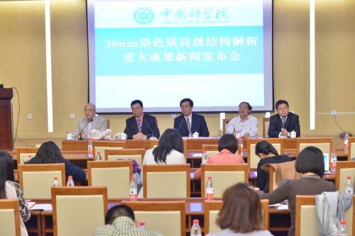4月23日下午,生物物理所 “30nM染色质高级结构解析”重大成果新闻发布会在9501会议室召开。会议由徐涛所长主持,院前沿科学与教育局许瑞明局长,科学传播局周德进局长,生物物理研究所李国红研究员、朱平研究员,新华社、光明日报、经济日报、中央人民广播电台、中国国际广播电台、中国日报、科技日报、中国青年报、人民网、新华网、中国网、新浪网、中国教育电视台、北京人民广播电台、北京日报、北京晨报、北京晚报、北京青年报、中国科学报和中国科学杂志等20多家媒体记者及生物物理所百余名科研人员出席本次新闻发布会。