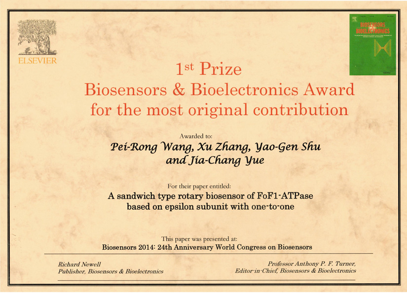 在2014年5月27-31日召开的第24届世界生物传感学术大会上,中科院生物物理所乐加昌研究员的专题报告(Keynote speech)——“ATP酶分子马达生物传感器”,经过层层评审,以其创新性获得大会最佳论文奖第一名。本次大会共有4人获得最佳论文奖:第一名、第二名和并列第三名。