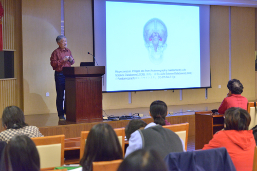 接下来,赫荣乔研究员介绍了2014 年度诺贝尔生理学或医学奖的研究工作。美国及挪威三位科学家John O'Keefe、May-Britt Moser和Edvard I. Moser因“发现构成大脑定位系统的细胞”而获奖。赫荣乔研究员深入浅出地介绍了三位科学家的主要贡献及其实验方法和研究思路。他将John O'Keefe的主要贡献高度概括为一句话,即发现“位置细胞”,绘制“海马地图”。他介绍了John O'Keefe如何通过由绝缘玻璃材质包裹的渡铂钨丝微电极组成的微驱动固定在小鼠的头骨上采集信号进行研究。John O'Keefe在1971年发现并证明了大鼠脑的海马存在一种神经细胞,每当大鼠身处空间的某个特定位置的时,这种细胞就会被激活;当大鼠身处其他位置时,则位于海马内其他部位的神经细胞被激活。John O'Keefe称之为“位置细胞”,并认为这些细胞组成了大脑中的“地图”;发现了位置细胞的功能:1)在任何给定的时间条件下,确定动物在环境中的位置;2)记忆环境中的经历,似“情景记忆”。