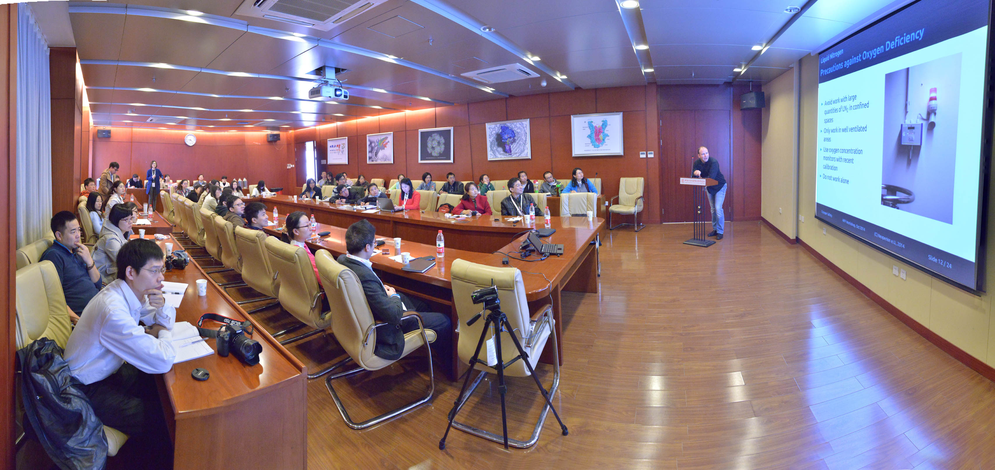 培训过程中, GuenterResch博士先对透射电镜冷冻样品制备做了综合概述,又在随后的几天中对高压冷冻和冷冻替代的原理、应用领域、以及仪器的操作方法和技巧的方面进行了详细的介绍。生物成像中心在冷冻样品制备方面拥有Leica EM PACT2和Leica EM HPM100两台高压冷冻仪、两台LeicaEM AFS2冷冻替代仪,以及Leica EM FC6/FC7两台冷冻超薄切片机。Resch博士每天上午对各个仪器的原理和操作方法进行分别介绍,下午在成像中心做操作演示及上机实践。学员们遇到问题随时向Resch博士提问,Resch博士不仅耐心地回答学员的提问,并将问题记录并汇总,在最后一天的问题及解答讨论会上又做了详细的讲解。
