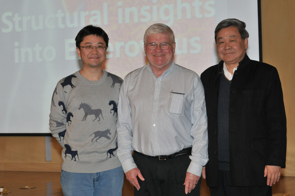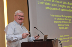 首先,Sripps研究所的Jack Jonson教授和生物物理所的饶子和院士做了两个关于病毒研究领域的主题报告。Jack Jonson教授向大家介绍了其实验室以 Nudaureliacapensis omega virus、Sulfolobus turreted icosahedral virus 等病毒为基础,利用晶体学、电子显微学等技术手段系统地研究了病毒成熟的过程。饶子和院士作为中国病毒结构生物学的领军人物,他们的工作重点是与人体重大疾病密切相关的病毒的研究。饶院士向大家展示了过去几年在手足口病源病毒EV71以及CA16的系列研究工作,并且向大家阐述了基于结构的抗病毒药物研究动态。此外,饶院士还进一步展示了他们近期关于甲型肝炎病毒的重大研究进展。