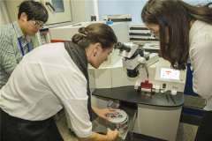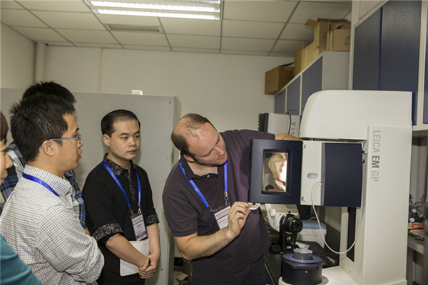 9月24日和25日的学员上机实训,包括了高压冷冻、冷冻替代、冷冻超薄切片以及投入式快速冷冻技术等细胞电镜冷冻制样方法中最重要的几大技术。Guenter Resch博士对学员进行了徕卡最新一代投入式快速冷冻仪Leica EM GP的使用操作培训;徕卡公司Cveta Tomova博士和生物成像中心孙磊高级工程师对学员进行了徕卡最新一代高压冷冻仪Leica EM ICE的使用培训;Diatome公司技术专家Helmut Gnaegi及生物物理所薛艳红高级工程师负责冷冻超薄切片技术培训;徕卡公司应用工程师张艾敬以及生物成像中心李喜霞博士负责冷冻替代技术培训。