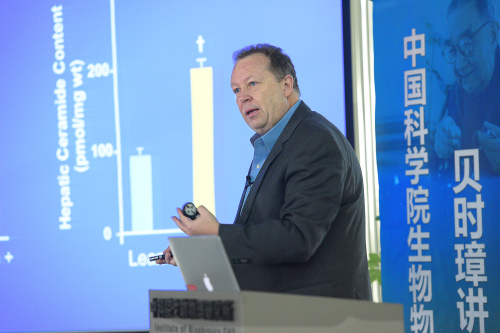 报告会上,Philipp Scherer教授首先介绍了脂肪组织对于机体脂代谢稳态的重要性。高热量食物摄入的增加以及运动的减少导致了目前肥胖发生急剧增加,肥胖会增加胰岛素抵抗发生的几率,但是其分子机制研究的并不清楚。实验发现神经酰胺可能是诱导胰岛素抵抗发生的主要原因。进一步的研究发现Adiponectin (脂联素)能够抑制神经酰胺的产生并缓解胰岛素抵抗。Adponectin是脂肪组织分泌的内分泌因子,能够显著的改善机体各个器官的胰岛素灵敏度。Adiponectin敲除小鼠肝脏和血液中的神经酰胺显著上升,胰岛素抵抗发生,而过表达Acid Ceramidase (酸性神经酰胺酶)则能抑制高脂饮食引起的胰岛素抵抗。