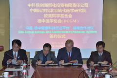 中科院北京转化医学研究院副院长王永光教授主持签约仪式,对四方战略合作协议的背景及合作项目进行了详细介绍。中科院国有资产经营有限责任公司副总经理、中科院创新孵化投资有限责任公司董事长陈晓峰、欧美同学基金会副理事长兼秘书长李海峰、德中医学协会会长Christian Ohrloff和王永光教授共同签署了“中德-德中健康科技促进平台”战略合作协议。
