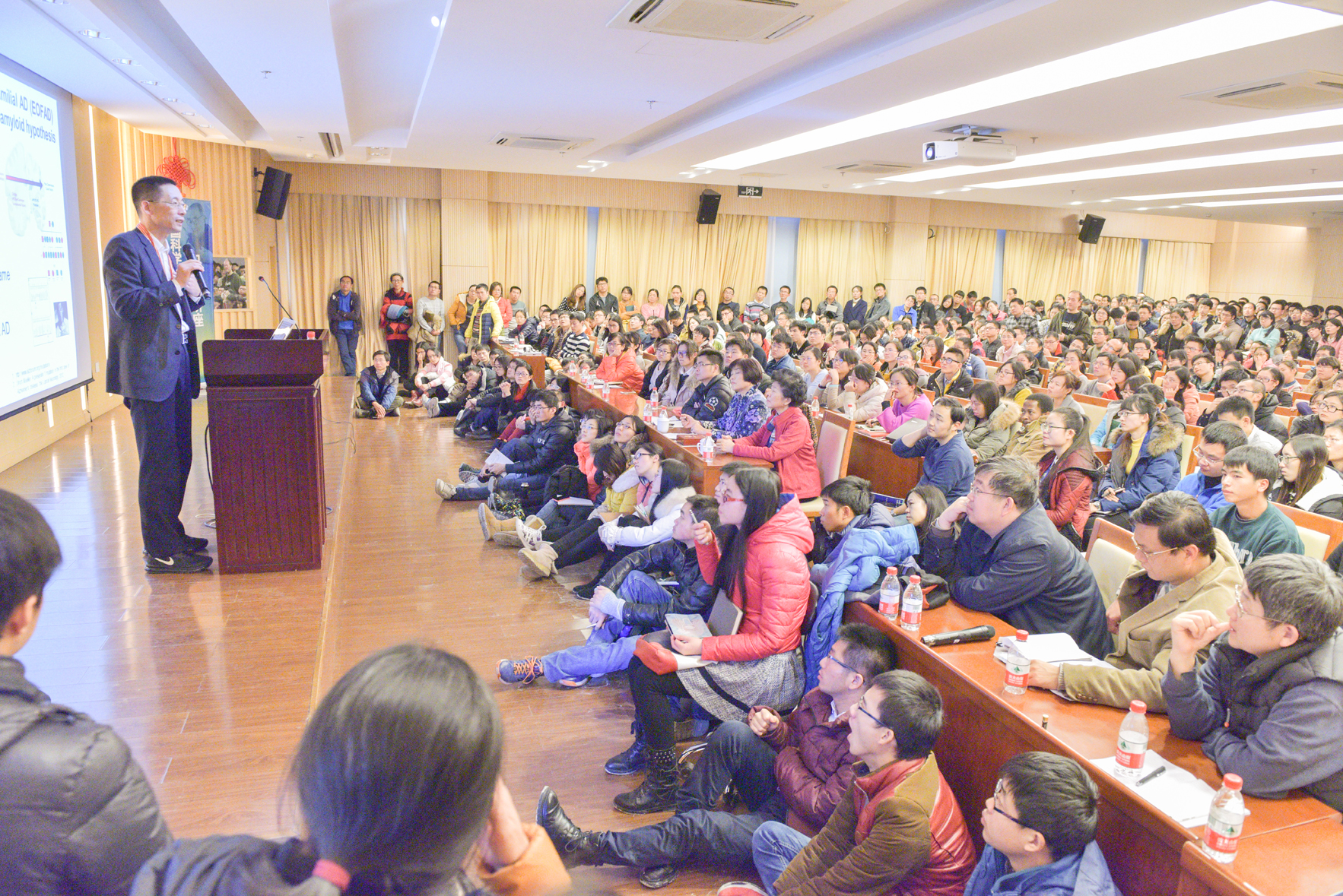 随后,施一公院士重点介绍了他们团队利用冷冻电镜技术对人γ分泌酶的最新工作进展。通过对整个课题研究历程的回顾以及对人γ分泌酶与阿兹海默症相关性研究背景的介绍,施一公院士根据人γ分泌酶结构的分析及阿兹海默症常见突变位点的分析,提出了阿兹海默症与Aβ蛋白沉积无相关性的新观点,为阿兹海默症的发病机理及治疗方向提供了新的依据。