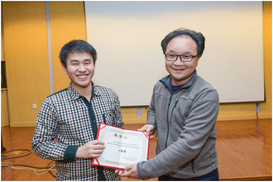 卫涛涛研究员给李俊颁发口头报告一等奖 |