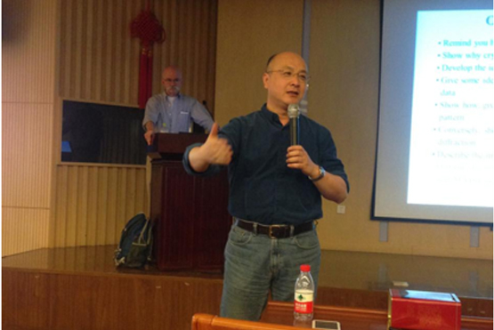 考虑在场同学欠缺的数理背景,Sweet教授首先通过对比可见光棱镜的成像过程,生动形象地讲解了X射线晶体的衍射原理,晶体学衍射图样的形成原因,以及晶体衍射数据实际测量的方法,深入浅出地讲述了傅立叶变换以及逆变换这一蛋白质结构测定的核心原理,以及晶体学的对称性和相位解析的常用方法。并以一个具体计算为例,讲解了Patterson函数的物理意义,让同学们能直接清晰地理解相位解析的物理图像。Sweet教授讲座长达3个小时之久,涵盖了X射线晶体学的基本原理,内容丰富,展示形象生动,现场气氛活跃。