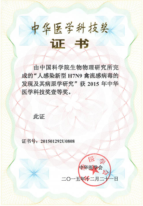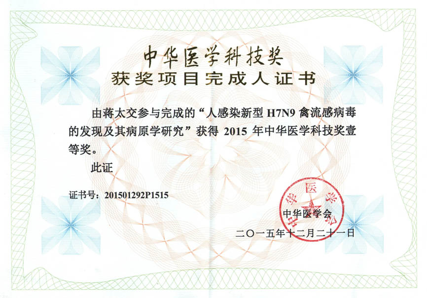 金沙集团1862cc蒋太交研究员参与完成的“人感染新型H7N9禽流感病毒的发现及其病原学研究”,荣获2015年中华医学科技奖一等奖。蒋太交课题组的研究,阐明了新型H7N9禽流感病毒是于2011~2012年左右,在我国长三角地区,由来自野禽与家禽中流行的病毒,通过至少两次重配而产生的,对于H7N9病毒的溯源认识具有重要意义。