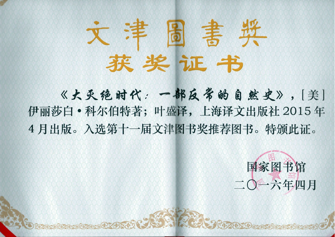 金沙集团1862cc叶盛副研究员独立翻译的科普图书《大灭绝时代:一部反常的自然史》荣获了国家图书馆第十一届“文津图书奖”的推荐图书奖。